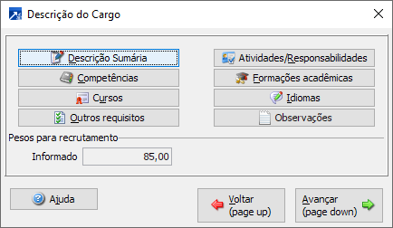 Ao clicar no botão < Descrição sumária > , vai abrir uma nova tela onde deve ser incluida a descrição sumária, bem resumida, compacta do cargo. Esta descrição servirá para recrutamento e seleção, cargos e salarios e Saúde ocupacional. Veja a seguir um exemplo do preenchimento de cada aba datela acima.