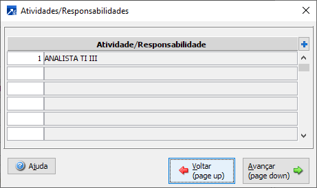 Na primeira linha das atividades clica F8 e vai abrir todas as opções de atividades que foram cadastradas, aí deve ser selecionadas as pertinentes a este cargo somente. Neste exemplo foi incluida uma atividade somente, em forma de texto, mas também poderia ter sido desmembrado em varios itens individuais. Caso a atividade ainda não está cadastrada no SIGER®, pode clicar F8, F5, F4 para achar o proximo número vago e cadastrar a atividade e depois selecionar a mesma no referido cargo.