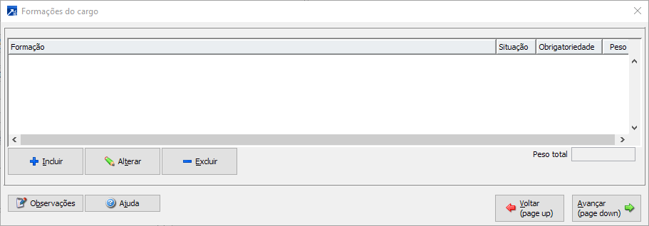 Clicar no botão < Formações > e vai abrir a tela abaixo. Em seguida clicar no botão < incluir > e selecionar a formação desejada para o cargo conforme as telas abaixo. Pode selecionar mais de uma formação.
