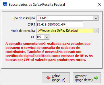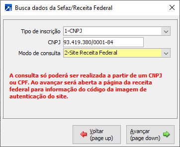 Quando foco está nesse campo, é possível utilizar essa função para buscar dados do CNPJ informado a partir do Site da Receita Federal OU Webservice SeFaz Estadual.