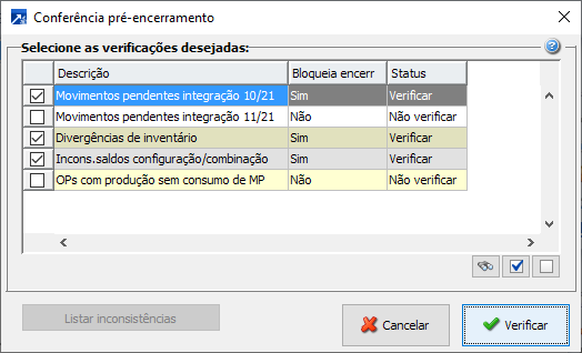 Ao acessar o menu, o SIGER® já vai trazer selecionadas as verificações desejadas considerando analisar todos os movimentos que eventualmente possam barrar o encerramento mensal.