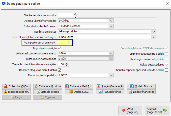 Por fim, temos a última parametrização que diz respeito ao % “global” inerente aos impostos incidentes sobre a venda. Ou seja: Esse campo representa o % total de Impostos p/ margem de contribuição.