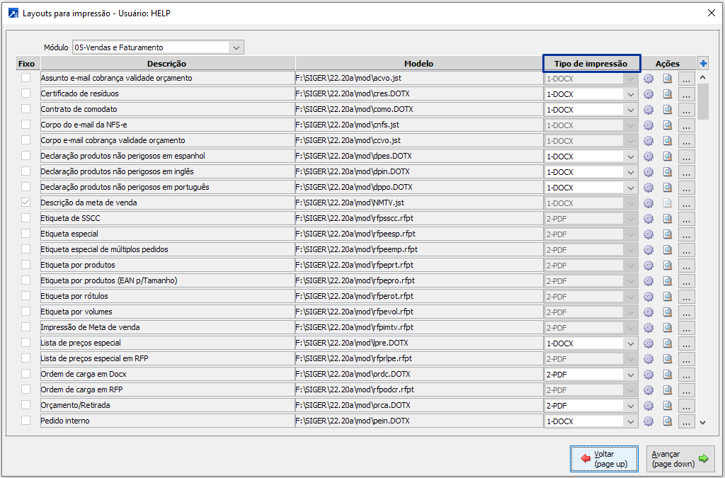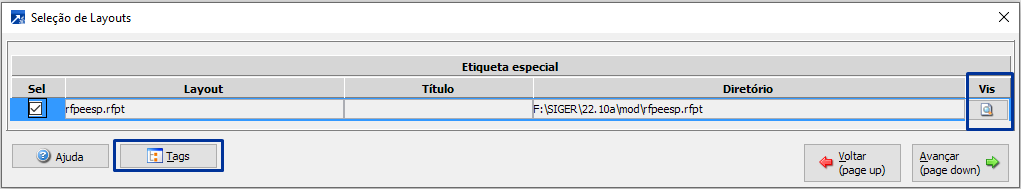 Abre a janela para seleção do modelo. Nessa janela, é possível selecionar qual será o modelo utilizado para impressão e, além disso, visualizar as tags do formulário.
