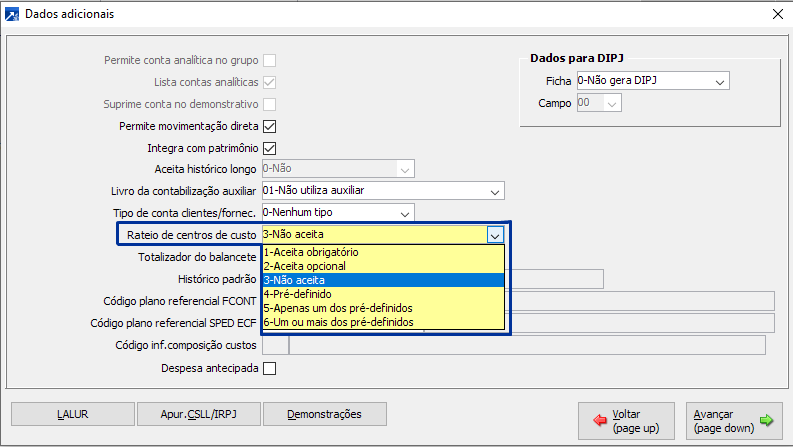 2- Acessa rateio de centro de custos, mas a informação não é obrigatória.
