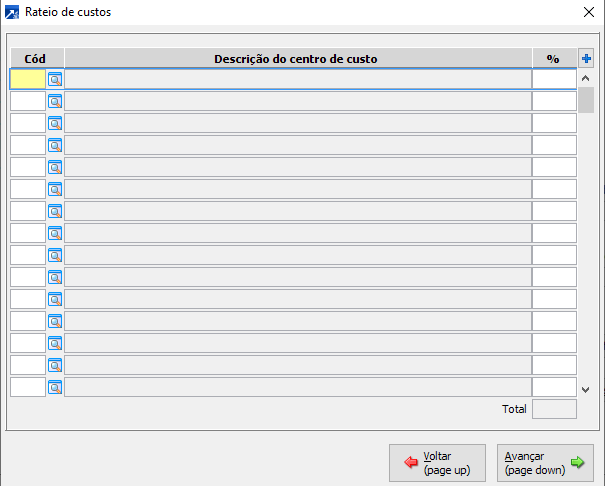 6- Acessa rateio de centros de custos permitindo informar valor para um ou mais dos pré-definidos.