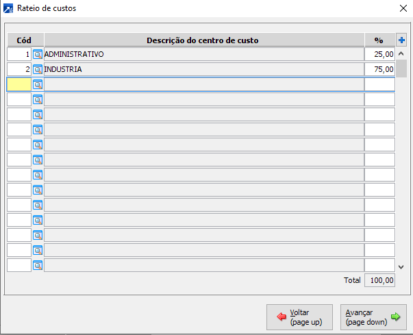 Para pré-configurar os rateios, basta indicar seus códigos, conforme abaixo. Ainda, é possível atribuir um percentual para aqueles custos/despesas que repetem-se. Isso não quer dizer que não seja possível acrescentar, excluir ou alterar no momento do lançamento, tanto para o código, qanto para o percentual do rateio. Para tanto, basta observar as informações acima.