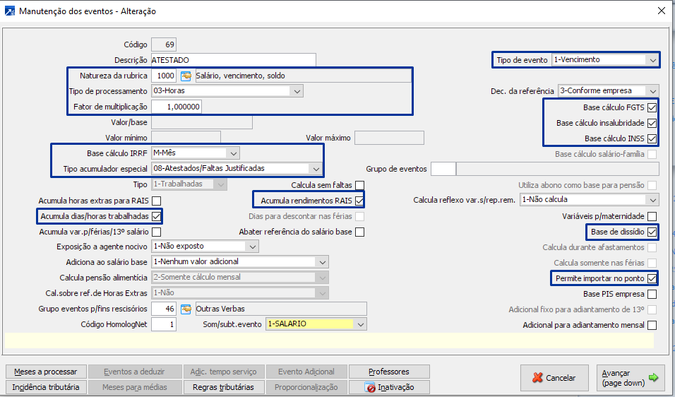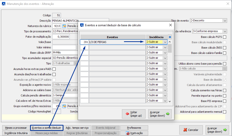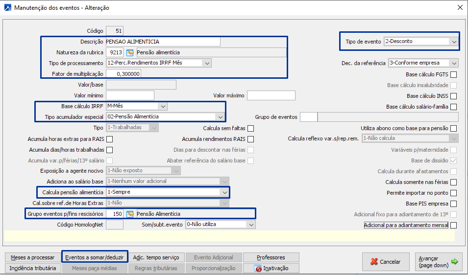 Evento de Pensão alimentícia: para configurar o evento de pensão alimentícia, se faz necessário alguns campos CHAVE, como tipo de processamento, fator, base de IRRF, tipo de acumulador especial e quando deve ocorrer o calculo.
