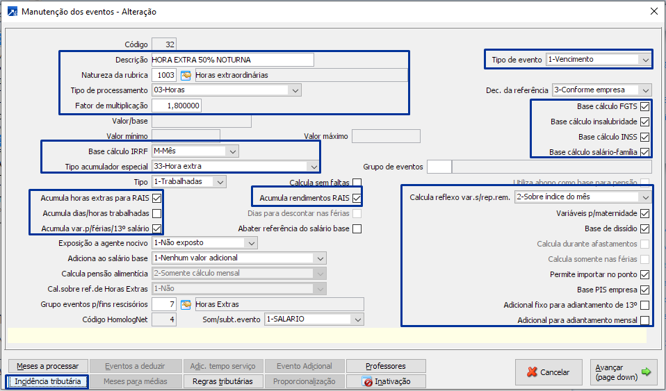 Eventos de Hora extra Noturna: a configuração do evento de hora extra noturna, devera ter o fator do adicional noturno + fator da hora extra, que pode variar, com no mínimo 50%.