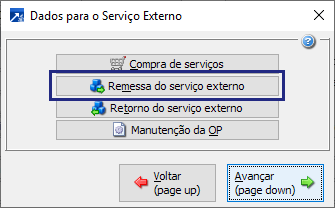 3-OP/Sequência/Talão/Centro de custo: Indica que acessa a remessa do serviço externo a partir do número e sequência da ordem de produção, número do talão e código do centro de custo.