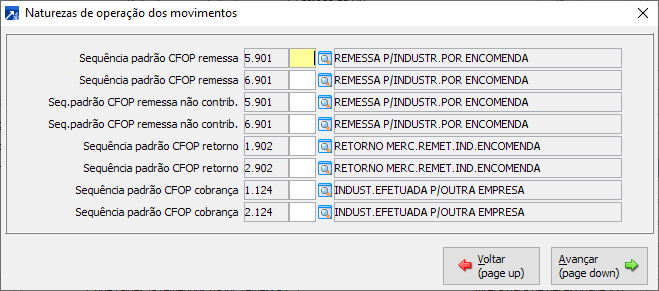Sequência padrão para as naturezas de operação utilizadas nos movimentos de remessa e retorno do serviço externo.