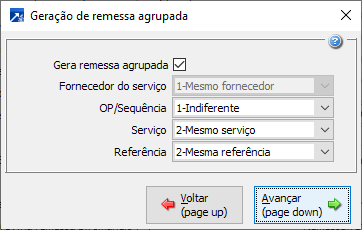 Nessa janela são definidos os agrupados para geração da remessa de serviço externo a partir da opção "P-Gerar Remessa Agrupada".