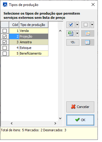 3-Sim, conforme o tipo de produção da OP: Esta opção indica que não permite gerar remessa de serviço externo se não existir lista de preço para o fornecedor/serviço, permitindo definir a restrição por tipo de Ordem de Produção (acessível pelo botão ao lado).