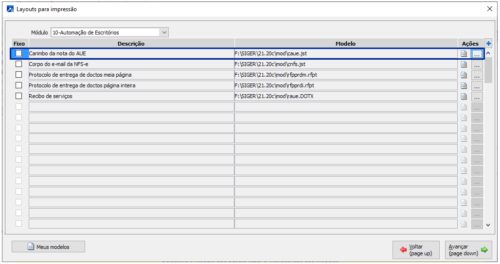 As configurações do módulo automação de escritórios estão disponíveis no menu AUE 1.2-A, no botão <Autom.Escritórios>.