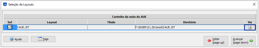 Selecionar o botão <...> do campo "Carimbo da nota do AUE".