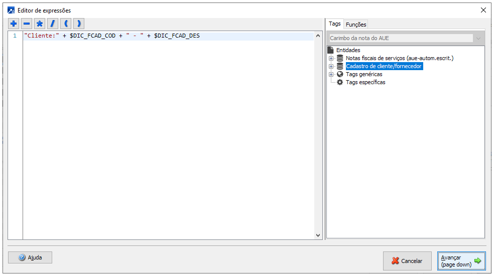 Será exibida a janela do edito de expressões do SIGER®, neste exemplo será listada a literal "Cliente:" e concatenado o código e razão social do cadastro do cliente da nota. Para mais informações sobre o editor de expressões acessar o link + Saiba mais
