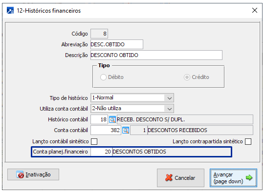 Utilizando essa configuração será necessário configurar as contas do planejamento no cadastro dos históricos financeiros referente aos juros e descontos, no menu FIN 1.4-A, tabela 12. + Saiba mais