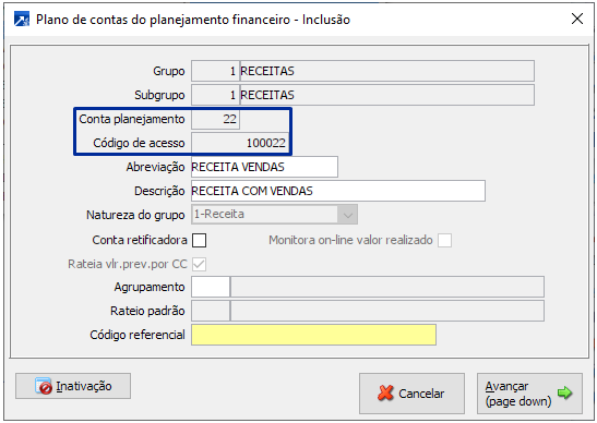 4-Presume Subgrupo + Conta com 5 dígitos: Faz planejamento aceitando código de acesso e permitindo duplicar o código da conta com tamanho de 5 dígitos.