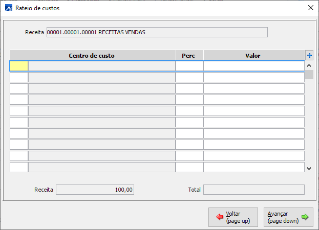 Rateio centros de custo p/receitas