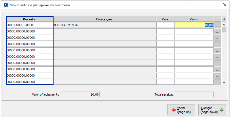 Importante: Caso possua a integração com o módulo contabilidade, a conta contábil informada no movimento de contrapartida precisa estar marcada para aceitar planejamento financeiro, a janela do movimento do planejamento financeiro será exibida ao avançar para gravar o movimento de contrapartida.