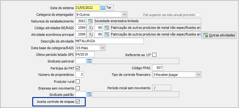 1- MENU 1.2-A botão <Dados adicionais 1>, marcar a flag “Controle de etapas”.