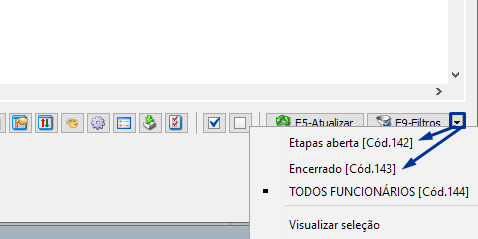 3- Criar filtros para visualizar as etapas, exemplo: etapas em abertas/em andamento MENU 1.8-D botão <F9-Filtros> botão <Filtros Adicionais>.