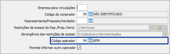 Informa o usuário, F8 pesquisa o usuário, após clica no botão <Vinculações> e no campo "Código do operador" informa operador deste usuário.