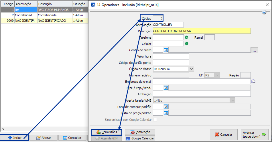 1.2 - Cadastrar os operadores e configurar suas permissões MENU 1.C-3 tabela 14-Operadores, botão <Incluir>, botão <Permissões>.