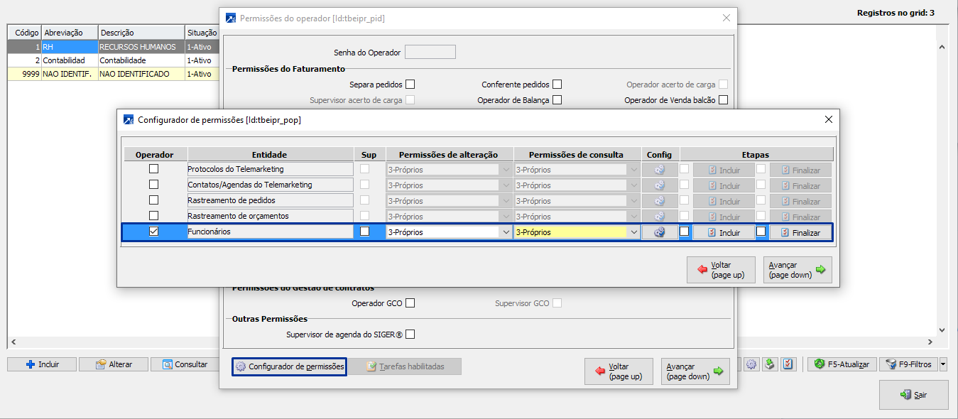 No botão <Permissões>, clicar no botão <Configurações de permissões> MARCAR a flag “Funcionários” e configurar se poderá, incluir, alterar, excluir e encerrar as etapas.