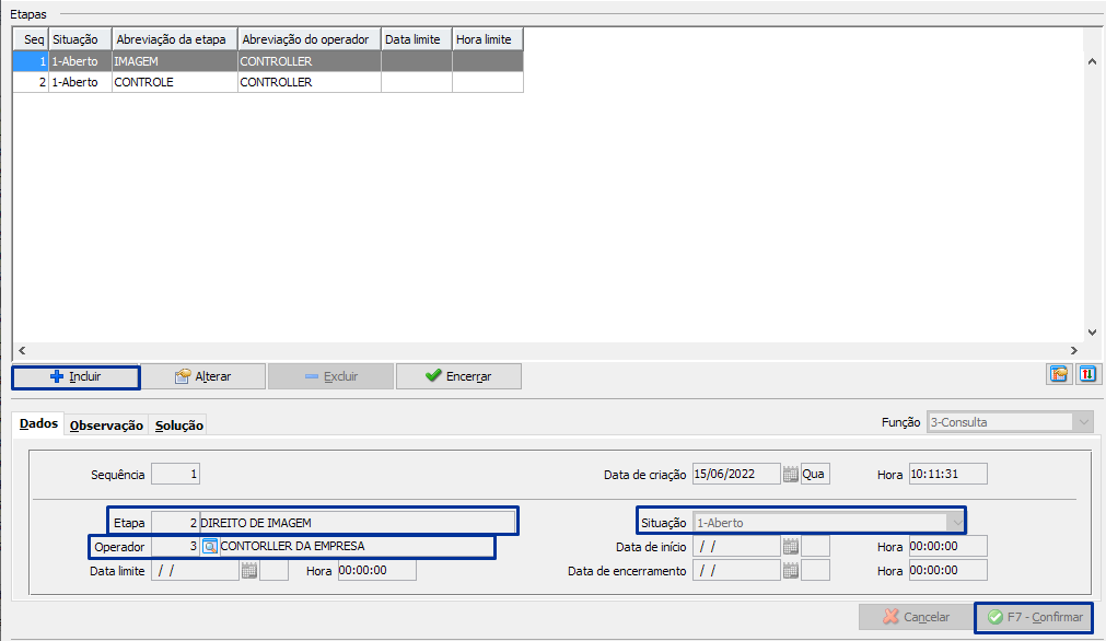 Observação: a flag SUP, o operador terá poderes de supervisor, poderá fazer alteração em todas as etapas, e poderá incluir e finaliza-la.