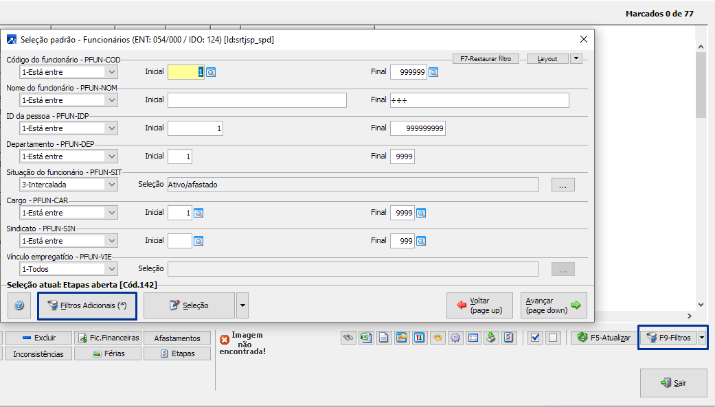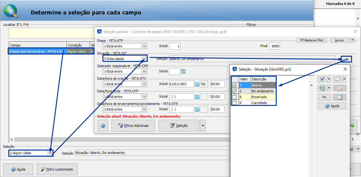 3.1- SELECIONE o campo “Etapa dos funcionários” para fazer o filtro desejado, neste exemplo vamos fazer o filtro das etapas em aberto e em andamento. Selecionar a opção 2-Algum válido, no campo "Situação" selecionar opção 3- INTERCALADA e clicar no botão 3 pontinhos e selecionar as opções desejadas e clica no botão avançar até chegar na tela da seleção padrão de funcionários, para salvar a seleção.