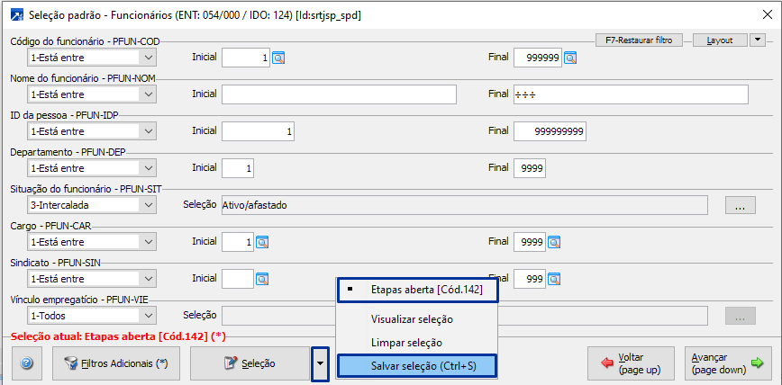 3.2- para salvar a seleção criada, na tela SELEÇÃO PADRÃO DE FUNCIONÁRIOS, na setinha ao lado do botão <Seleção>, opção “Salvar Seleção”.