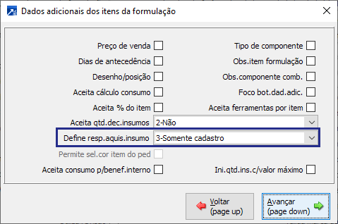 Campo "Define resp.aquis.insumso = 3-Somente cadastros"