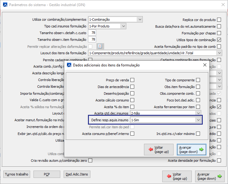 No GIN 1.1-P, botão <Gestão Industrial>, botão <Dad.Adic.Itens>, campo "Define resp.aquis.insumo=1-Sim":