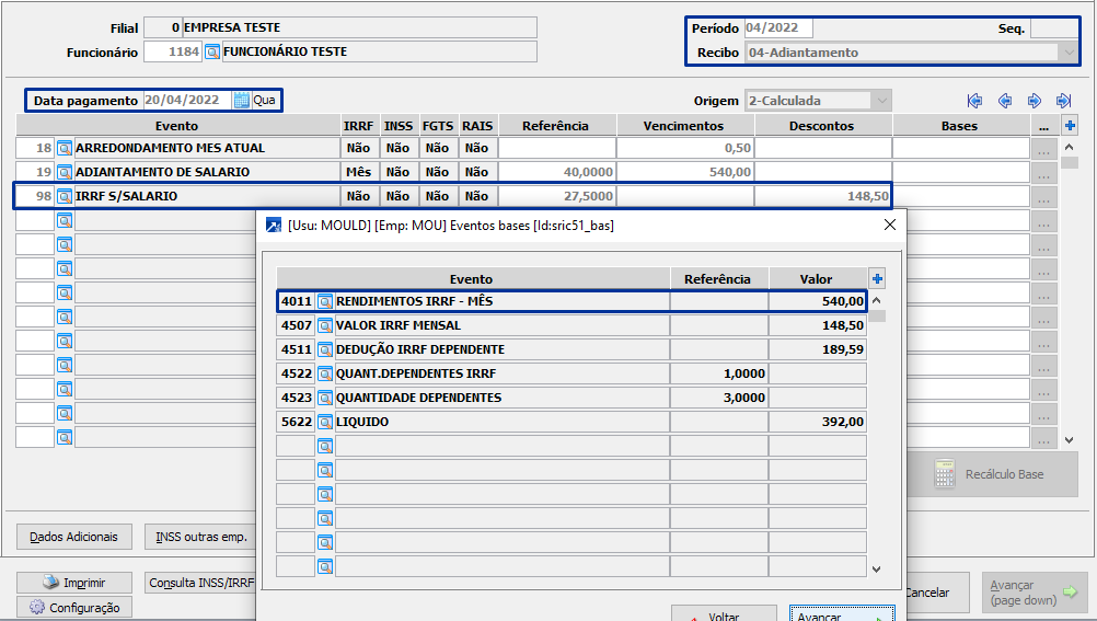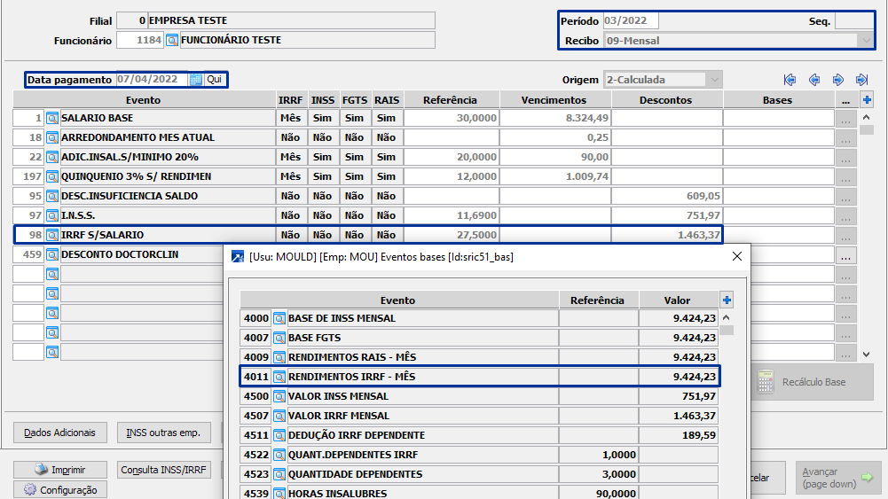 Para conferir as datas de pagamento de cada pagamento e base de cálculo de IRRF MENU 3.9-C, botão "Eventos bases" ou no botão <Configuração> marcando a flag "Exibe eventos bases na tela principal".