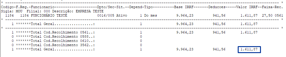Flag marcada, irá listar o total do IRRF pelo código do recolhimento, FUNCINÁRIOS código 05161 RPO-LARE e RPA código 0588.