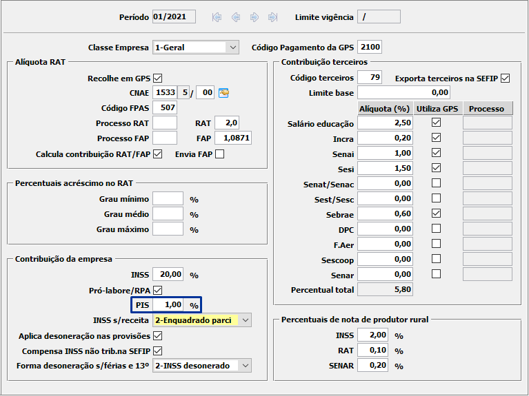 No SIGER® se faz necessário configurar na empresa o percentual de 1% MENU 1.2-A botão <Classe da empresa> no campo "PIS" e mensalmente após o cálculo da folha, gera-se totais MENU 4.1-G e lista o total da folha MENU 4.1-T no final do relatório tem o campo com a base PIS e o valor a recolher.