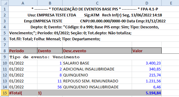 MENU 4.1-P lista os eventos que estão sendo considerados na base do PIS. Relatório será gerado em Excel, utilizando para conferência, do evento e valor.