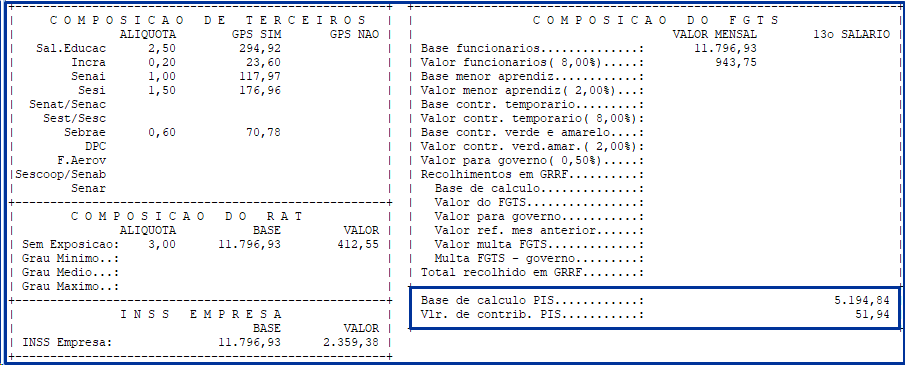 Total da folha com a base PIS e o valor a recolher MENU 4.1-T.