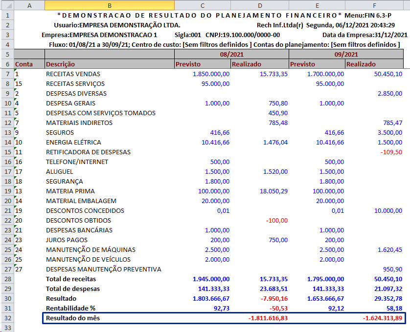 2-Resultado do mês: Lista linha com o valor do resultado do mês (realizado - previsto), exemplo do demonstrativo.