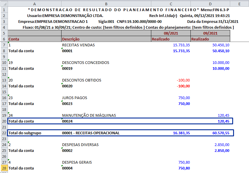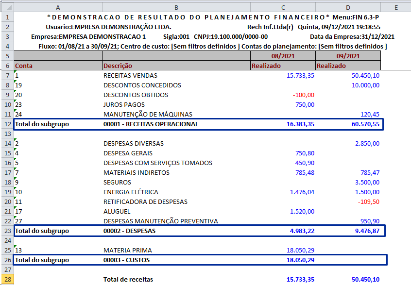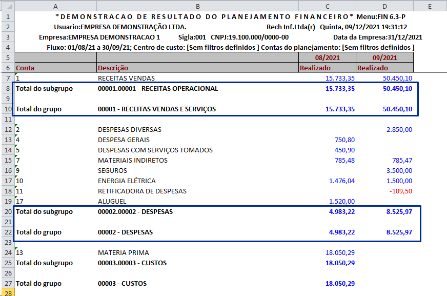 Exemplo do demonstrativo somente com os totalizadores de subgrupo e grupo.