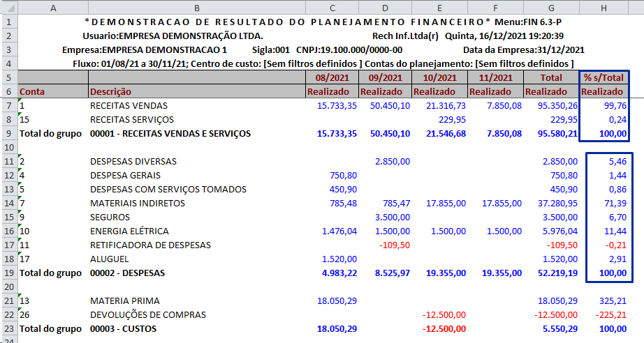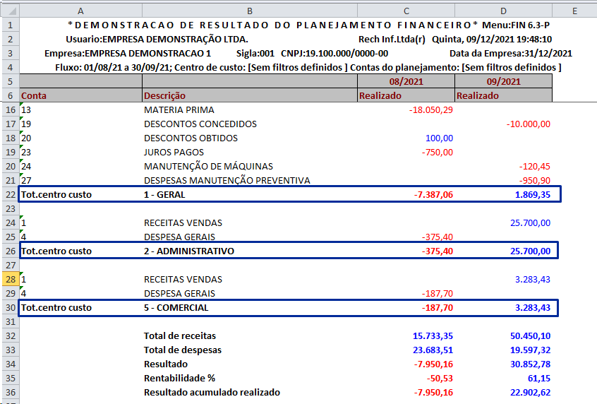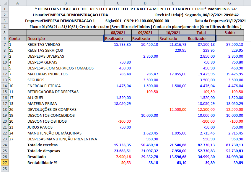 5-Result.acum.realizado: Lista uma linha com o valor acumulado dos meses, considerando somente os valores realizados, exemplo do demonstrativo.