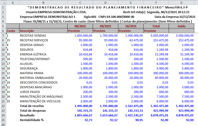 O demonstrativo é gerado no menu FIN 6.3-P (Demons.Result.Planej.Fin.).