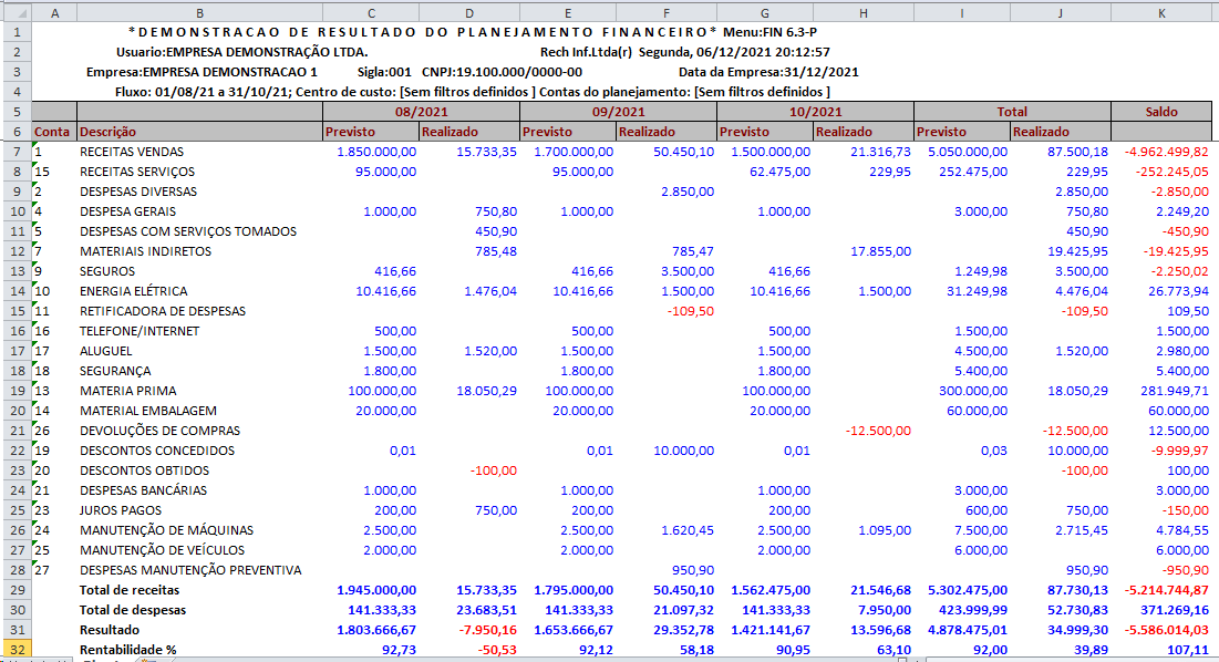 3-Previsto/Realizado: Lista os valores previstos e realizados, exemplo do demonstrativo.