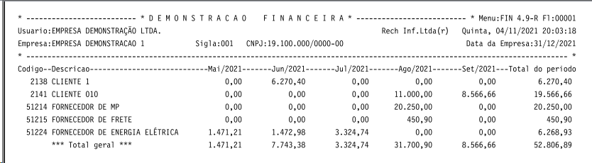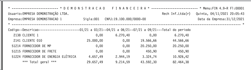 O demonstrativo financeiro diversos períodos totaliza os valores realizados de clientes e fornecedores, conforme os períodos selecionados, acumulando por mês, bimestre, trimestre, quadrimestre, semestral e anual.