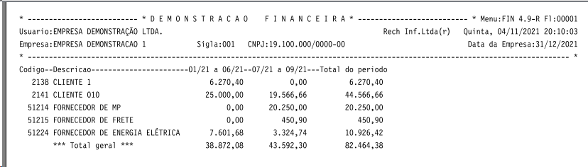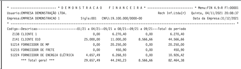 O demonstrativo é emitido no menu FIN 4.9-R (Demonstr.Fin.Div.Períodos).