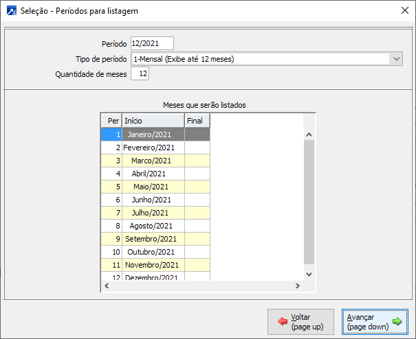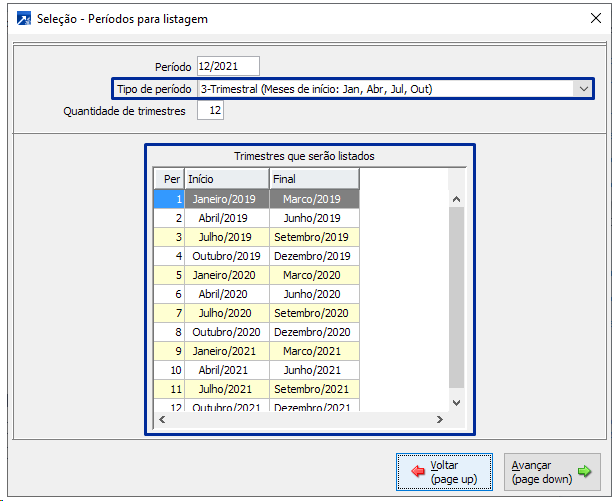 Ao avançar na janela "Seleção - Ordem do demonstrativo" será exibida a janela "Seleção - Períodos para listagem", conforme demonstrado na imagem a seguir.