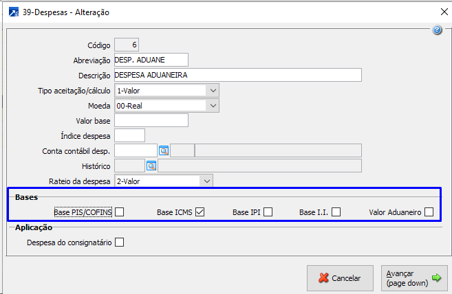 Cada uma das opções acima indica se o referido imposto será ou não base para cálculo da despesa. A leitura feita é a seguinte: A despesa será base para cálculo de PIS/COFINS, ICMS, IPI ou II? No exemplo acima será base apenas para ICMS.