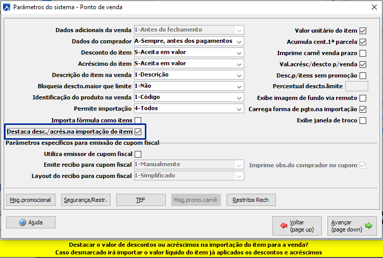 Para utilizar o recurso, é necessário desmarcar o campo localizado em 1.1-P, botão <Ponto de venda>, "Importa desconto/acréscimo do item".