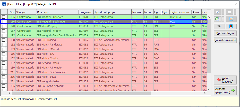 Observação: veja as informações contidas em cada arquivo (layout), clicando no botão <Documentação> na janela de seleção de EDI (acima).