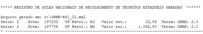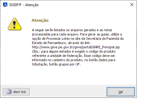 Em ambos os menus, o SIGER® irá gerar um arquivo contendo os dados da GNRE de acordo com as exigências do estado e salvar o mesmo no diretório que for indicado pelo usuário, para que posteriormente esses arquivos possam ser importados no programa gerador da guia.